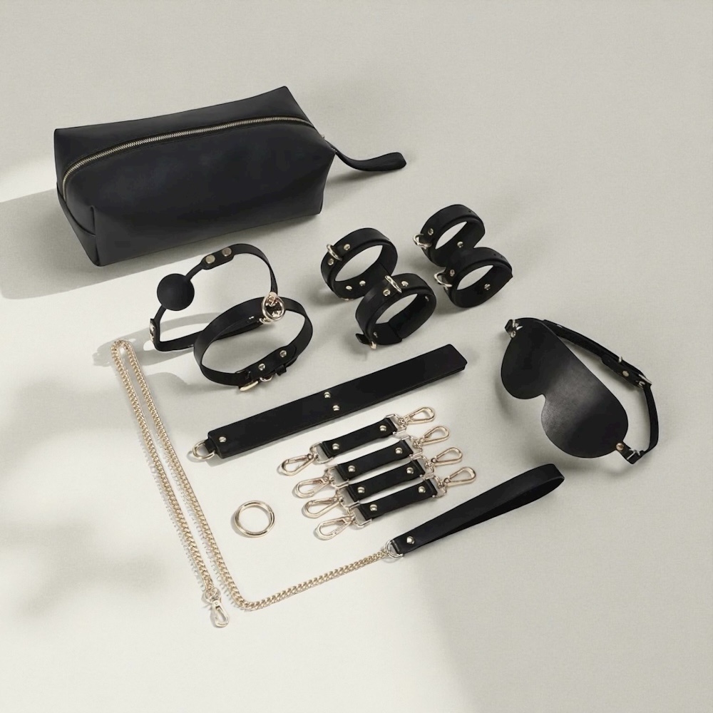 Cada detalhe foi pensado para transformar suas fantasias em experiências reais. Com 12 peças em couro sintético preto e detalhes dourados, o kit é ideal tanto para iniciantes quanto para quem já é fã do universo bondage e fetichista.